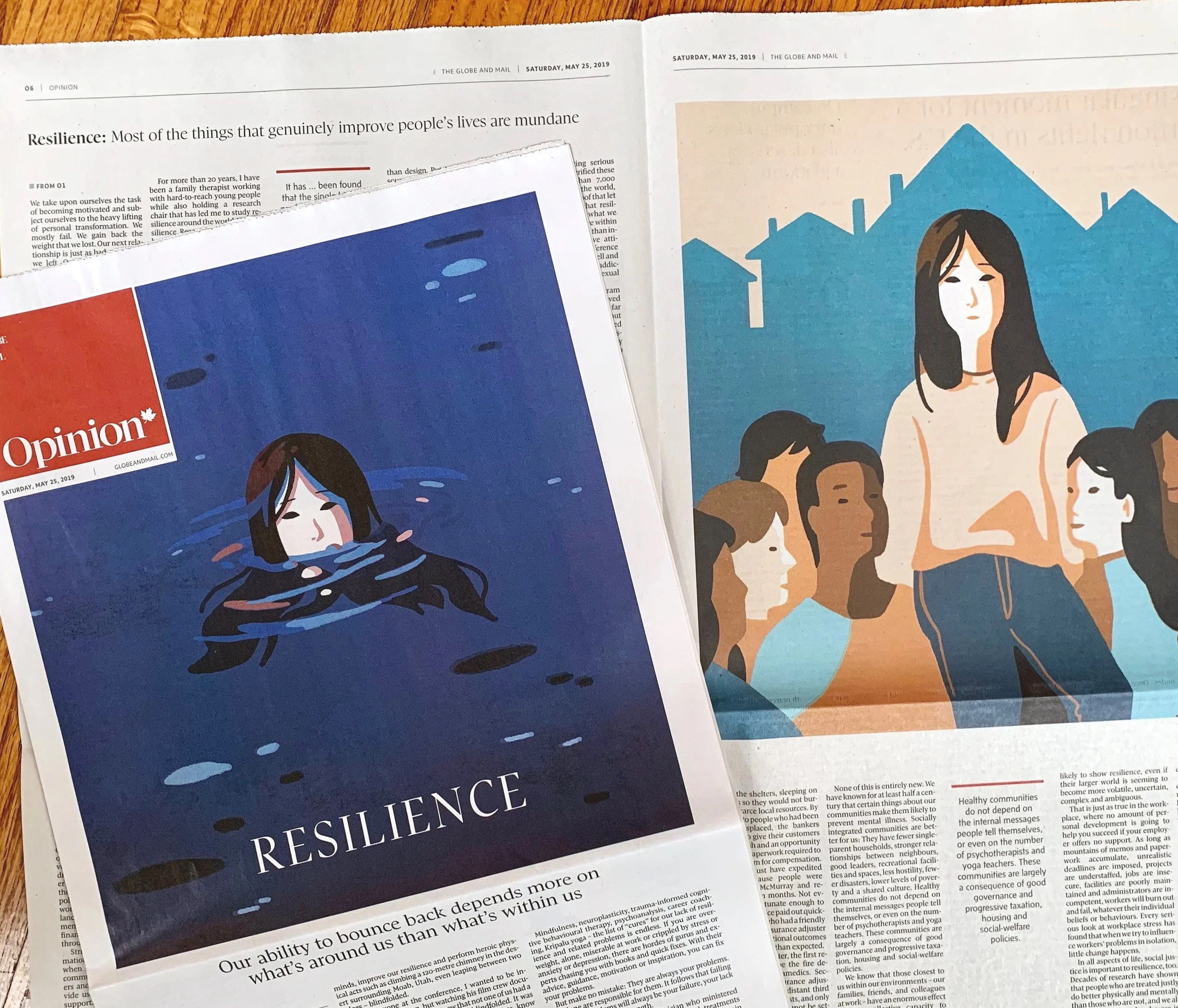 “Put down the self help books: Resilience is not a DIY endeavour.” Two feature illustrations for the Globe and Mail Saturday edition, May 2019.