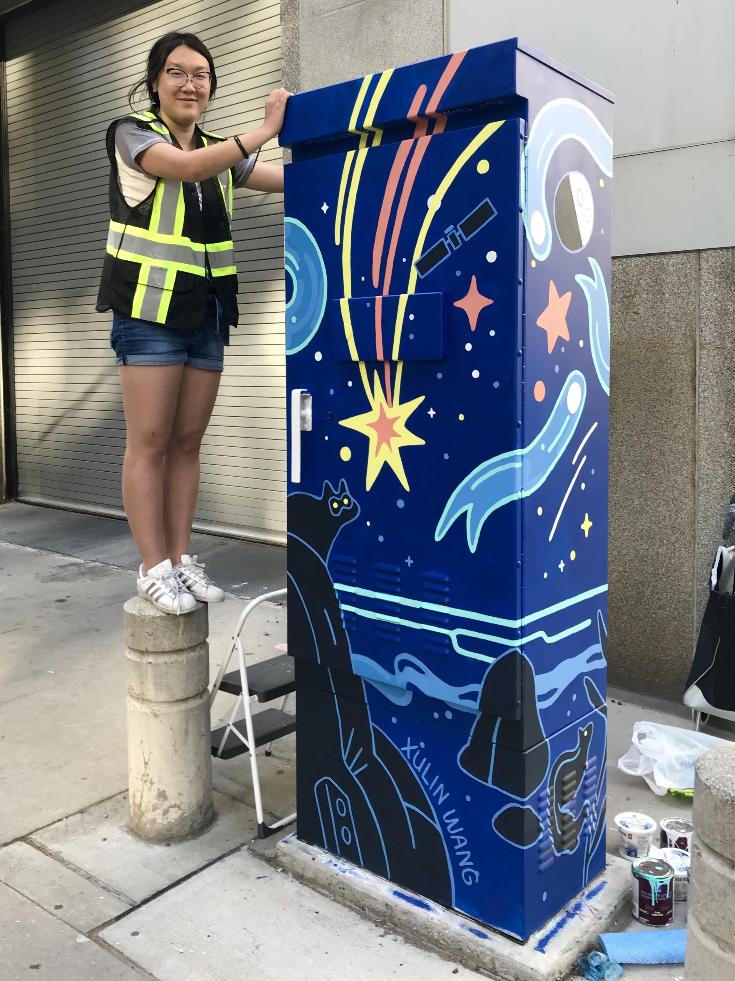 Traffic signal box mural at the corner of Simcoe and Richmond Street, commissioned by StreetARToronto and the City of Toronto, 2020.